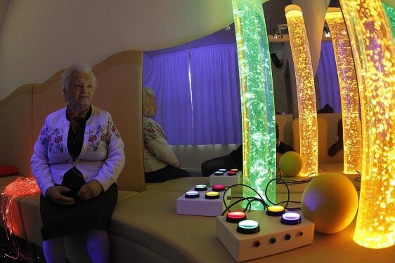 La primera sensación que tiene el visitante tras entrar en la cámara no es otra que la de dar un salto de décadas y recalar en una época futurista. Sin embargo, nada más lejos de la realidad, esta decoración moderna, gracias a la incorporación de columnas de agua multicolores entre otros elementos, es solo la cuidada fachada de una sala terapéutica que sirve para activar y consolidar los recuerdos del pasado.