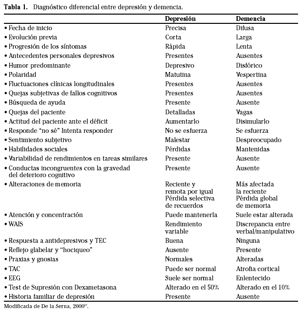 Los síntomas que nos han de hacer pensar en el diagnóstico de depresión y no de demencia se recogen en la tabla 1. Los más indicativos de depresión son la rápida instauración de los síntomas en pocas semanas, la rápida incapacitación del paciente, el predominio de las quejas subjetivas del tipo “soy muy torpe, no sé hacer las cosas, se me olvida todo, no sé, etc.”, unas pruebas neuropsicológicas que no confirman un deterioro global y significativo sino en todo caso alteraciones cognitivas sutiles de predominio subcortical, la intensa anhedonia y los antecedentes de episodios depresivos previos.